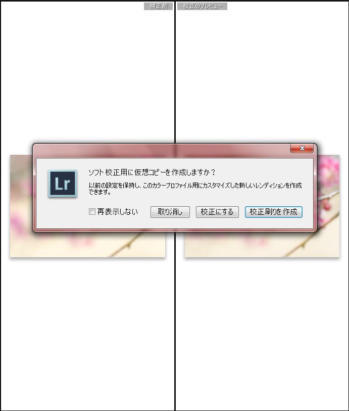 写真を色補正やトーンカーブなど、なにか修正を加えようとすると【ソフト校正用に仮想コピーを作成しますか?】というアラートがでてきます。