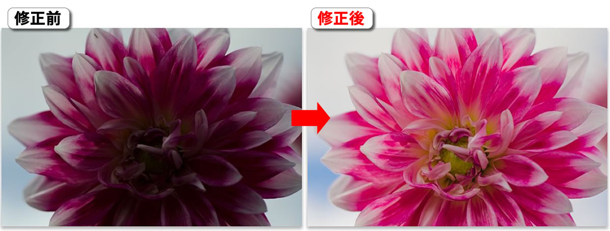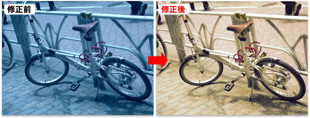 これは一目瞭然ですね。左側の写真はホワイトバランスが全く狂っていますので、その補正と角度を多少変更しています。